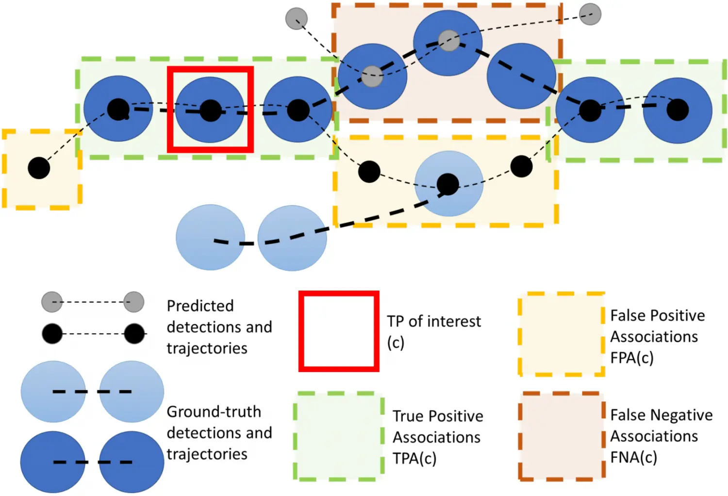 Привет, Хабр! С вами Матвей Шелухан и Тимур Мамедов из команды распознавания силуэтов в Tevian. Сегодня поговорим про метрики в задаче трекинга объектов, которая по праву считается одной из самых сложных в компьютерном зрении. Когда мы только приступали к её изучению, то принялись разбирать, какие есть датасеты, бейзлайны и метрики для оценки качества построенных траекторий. Будем честны: последнее было одним из самых сложных. Во-первых, метрик в рассматриваемой задаче довольно много, и ни одну из них не встретишь в стандартном курсе по машинному обучению. Во-вторых, в каждую из них порой сложно въехать, пока не придумаешь конкретные примеры (да, поэтому в этой статье будет много примеров). И, наконец, практически каждой посвящена отдельная научная статья, поэтому всю информацию приходилось собирать по крупицам. Кроме того, в процессе изучения литературы мы поняли, что универсальной метрики в данной задаче нет, поэтому для оценки качества алгоритмов необходимо смотреть на целый комплекс показателей. Данная статья будет полезна тем, кто занимается (либо просто интересуется) задачей трекинга и хочет понять, как устроены метрики оценки качества алгоритмов её решения. Как вы уже могли догадаться, мы за вас собрали всю нужную информацию в одну статью. Поехали! Постановка задачи трекингаМы выпускники ВМК МГУ, поэтому немного формализма. Извините. Итак, прежде чем рассказывать о метриках, нужно понять, в чем вообще заключается сама задача трекинга. Если говорить верхнеуровнево, то она сводится к детекции множества объектов на кадрах видео с последующей ассоциацией этих детекций между соседними кадрами. Совсем «на пальцах»: для каждого объекта нужно понять его расположение на всех кадрах видео. Результатом работы алгоритма трекинга являются траектории движения (или, как говорят, треки) этих объектов. Математически трек объекта можно записать как упорядоченный список состоящий из пар , где — координаты объекта, а — номер кадра, на котором были получены эти координаты. В нашем случае в качестве координат объектов выступают bounding box-ы или просто bbox-ы (прямоугольники, ограничивающие объект). Число обозначает количество кадров, на которых был найден объект. Кроме того, каждый трек характеризуется своим идентификатором . Проблемы в задаче трекингаТеперь о больном — о проблемах, возникающих при решении рассматриваемой задачи. По предыдущему предложению вы уже догадались, что в трекинге существует масса проблем, из-за которых могут возникнуть ошибки работы алгоритма. Рассмотрим только часть из них, потому что если мы увлечёмся рассказами о наболевшем, то забудем поведать вам о метриках, из-за которых мы тут все и собрались. Не ограничивая общности, в качестве отслеживаемых «объектов» будут выступать люди. Допустим, что человек на небольшое время зашел за какое-то препятствие (это может быть что угодно, даже другой человек) и тем самым пропал из зоны видимости камер. Такие ситуации принято называть окклюзиями (от англ. occlusion). По его возвращении нам бы хотелось сохранить его идентификатор, с чем большинство трекеров не всегда справляется. На словах может показаться, что это достаточно простая для решения задача. Однако практика показала, что люди двигаются достаточно хаотично и неравномерно. Не броуновское движение, но все же. Также вполне во