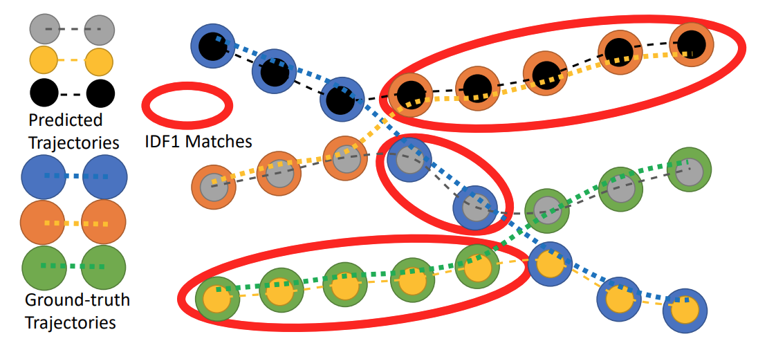 Как можно видеть, первые три типа ошибок возникают из-за неправильных предсказаний детектора, и только последняя ошибка относится к трекингу напрямую. Агрегация ошибокНа предыдущем шаге были получены ошибки на каждом отдельном кадре. Для трекинга же важно иметь представление о качестве алгоритма в рамках целого видео. Поэтому полученные ошибки агрегируются следующим образом: где — количество истинных объектов на кадре , — количество сопоставленных пар на кадре . На практике часто рассматривают только последние две метрики, MOTP и MOTA. MOTP (Multiple Object Tracking Precision) изменяется в пределах от до и показывает способность модели правильно локализовывать объекты и напрямую зависит от качества работы детектора. MOTA (Multiple Object Tracking Accuracy) выражает в том числе качество самой модели трекинга за счет вклада IDSW. Чем больше значение MOTA, тем лучше наша модель трекинга. IDF1: усовершенствованный поиск оптимального соответствияКак вы уже могли догадаться, главный недостаток MOTA и MOTP заключается в том, что они обе слишком сильно концентрируются на ошибках детектора и мало штрафуют за ошибки самого трекинга. Для того, чтобы избавиться от этого недостатка, в статье Performance Measures and a Data Set for Multi-Target, Multi-Camera Tracking была предложена метрика IDF1. Ее авторы меняют процедуру нахождения наилучшего соответствия между предсказанными и истинными треками. В отличие от предыдущих метрик, где соответствие вычислялось на каждом кадре по отдельности, при расчете IDF1 предлагается находить общее оптимальное соответствие сразу на всех кадрах видео. Матрица стоимостей сопоставления между истинными и предсказанными треками записывается как: где в учитываются случаи, когда предсказанная детекция либо не сопоставилась ни с каким истинным bbox-ом по порогу на IoU, либо сопоставилась с другим объектом ; в же учитываются случаи, когда истинный bbox не сопоставился ни с какой детекцией по порогу на IoU, либо сопоставился с детекцией с другим идентификатором . В обоих случаях суммирование происходит по всей предыстории пар треков. Для того, чтобы лучше понять данную формулу, стоит разобрать пример на картинке выше. На нем представлено три истинных трека (синий, оранжевый и зеленый) и столько же предсказанных траекторий (серая, желтая и черная) в разные моменты времени. Для нахождения компоненты матрицы стоимостей, к примеру, для синего истинного трека и серого предсказанного, необходимо «мысленно» представить, что эти треки сопоставились и посчитать и для данной пары треков в результате их сопоставления. В таком случае (так как серая траектория вначале три раза неверно сопоставилась с оранжевым истинным треком и в конце три раза неверно сопоставилась с зеленым истинным треком) и (так как синий трек вначале три раза неверно сопоставился с черной предсказанной траекторией и в конце три раза неверно сопоставился с желтым предсказанным треком). В сумме получаем . Аналогичным образом заполняется оставшаяся часть матрицы. Затем по полученной матрице стоимостей вычисляется оптимальное соответствие при помощи того же Венгерского алгоритма. Домашнее задание: рассчитайте матрицу сопоставления целиком и покажите, что оптимальное соответствие достигается при сопоставлении серого трека с синим, желтого — с зеленым и черного — с оранжевым. По найденным соответствиям считается метрика IDF1: где — эт